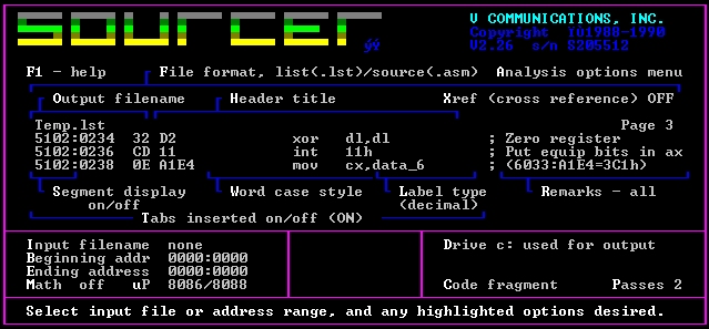 Le logiciel Sourcer de V Communications figure parmi les pionniers des décompilateurs ou désassembleurs ! A cette époque les décompilateurs agissaient moins en temps réel et plus comme un long traitement durant des heures et que l'on retourne le gigantesque résultat à la toute fin. Ainsi, il est très efficace pour des petits programmes de 30 Ko ou moins, mais en haut de cela, il génère des gros fichiers et passe beaucoup de temps à l'accomplir. Par contre, côté positif, il trouve généralement assez bien les commentaires pertinent pour expliquer les interruptions qu'utilise le programme.