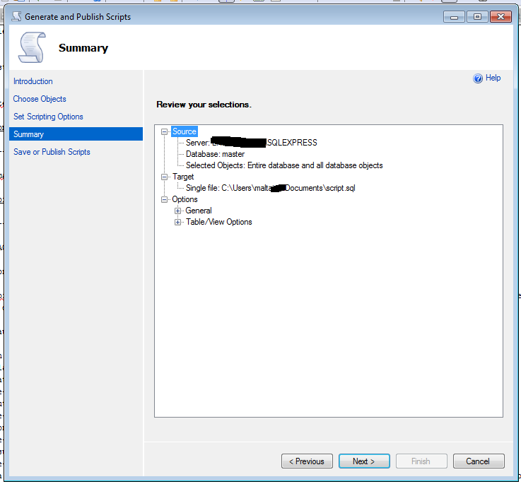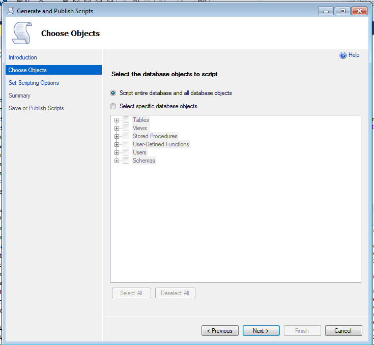 - Choisissez l'option «Script entire databases and all database objects» si vous voulez exporter toute la base de données et l'option «Select specific database objets» si vous voulez seulement quelques base de données ou des tables particulières puis cliquez sur le bouton «Next» :