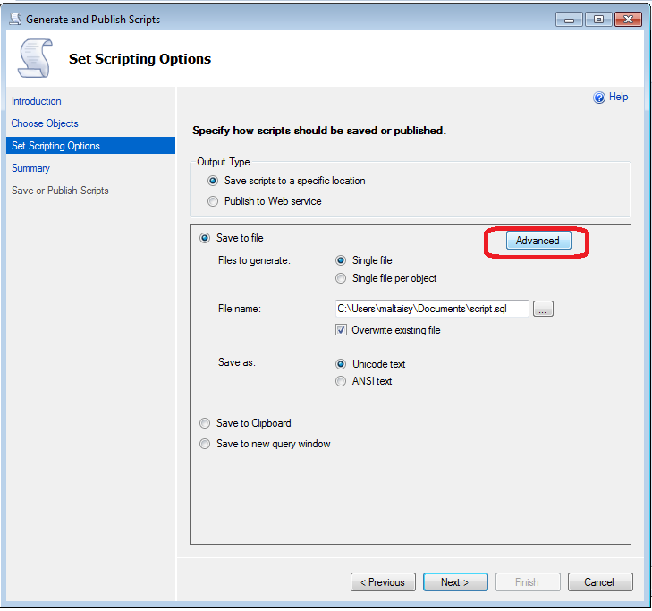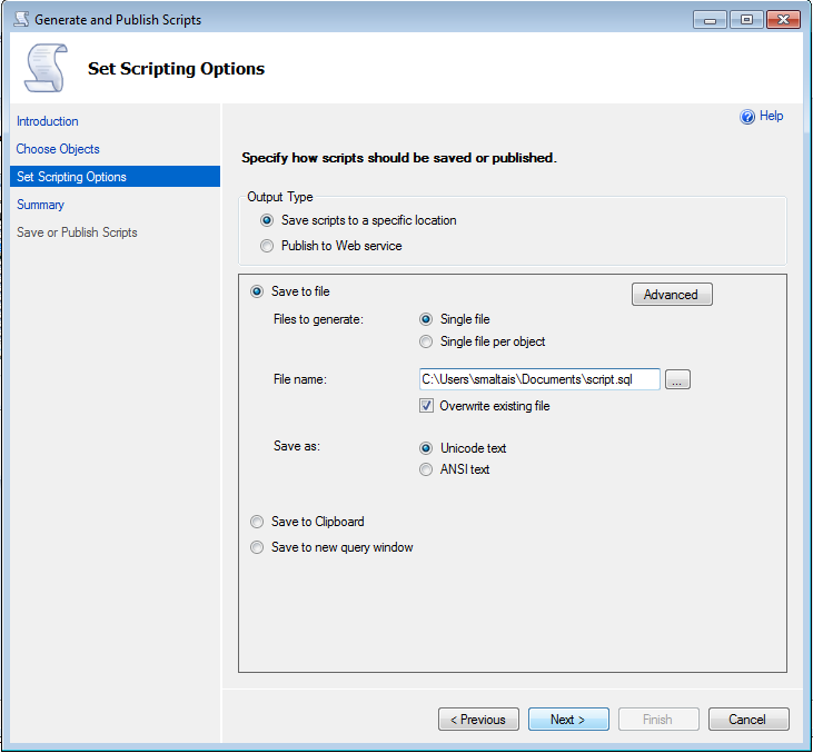 - Sélectionner l'emplacement où vous souhaitez enregistrer le fichier «.sql» et cliquer sur le bouton «Next» :