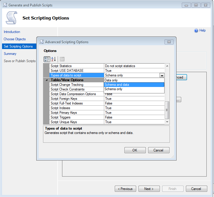 - Descendant dans la liste déroulante jusqu'à l'option «Types of data to script» et sélectionner «Schema and data» si vous souhaitez obtenir les structures des tables et les données quel contient, puis cliquez sur le bouton «OK» :