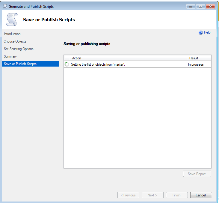 - Utiliser l'explorateur d'objet et cliquez sur avec le deuxième bouton de la souris (menu contextuel) sur le nom de la base de données (exemple : MASTER). Et sélectionner l'option «Tasks» et la sous-option «Generate Scripts...» :