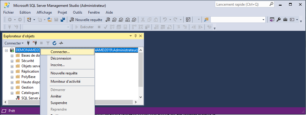 Le SQL Server Management Studio sépare également les tâches d'enregistrement d'un serveur et de connexion à un serveur. Cela signifie que l'enregistrement d'un serveur ne vous connecte pas automatiquement au serveur. Pour vous connecter à un serveur à partir de la fenêtre Explorateur d'objets ou Object Explorer, cliquez avec le bouton droit sur le nom du serveur et choisissez Connecter ou Connect.