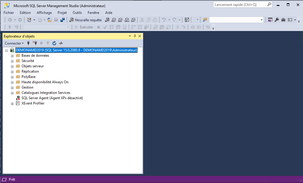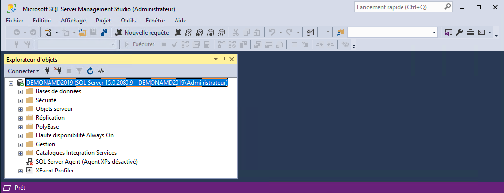 Lorsque vous cliquez sur Connect ou Connexion, le moteur de base de données se connecte au serveur spécifié. Après la connexion au serveur de base de données, la fenêtre par défaut de SQL Server Management Studio s'affiche. L'apparence par défaut est similaire à Visual Studio, de sorte que les utilisateurs peuvent tirer parti de leur expérience de développement dans Visual Studio pour utiliser plus facilement SQL Server Management Studio.