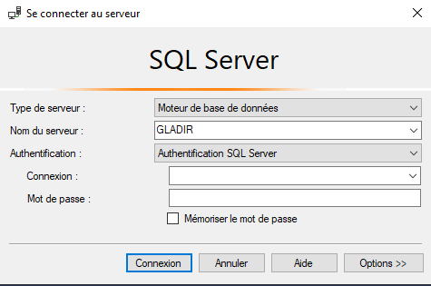 | Nom du serveur/Server Name | Sélectionnez ou tapez le nom du serveur que vous souhaitez utiliser. (En général, vous pouvez connecter SQL Server Management Studio à l'un des produits installés sur un serveur particulier.) | |