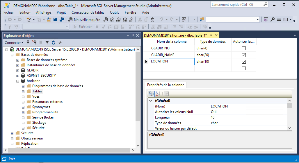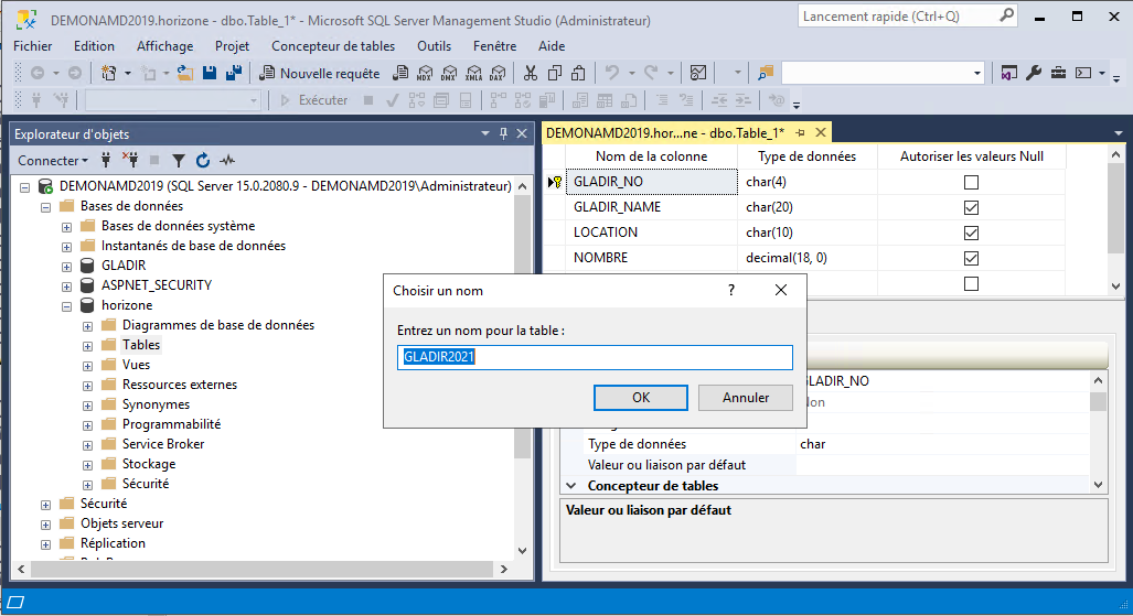 Pour illustrer la création d'une table à l'aide de l'Explorateur d'objets, la table GLADIR2021 de la base de données exemple sera utilisée comme exemple. Entrez les noms de toutes les colonnes avec leurs propriétés. Les noms de colonnes, leurs types de données, ainsi que la propriété NULL de la colonne doivent être entrés dans la matrice bidimensionnelle, comme indiqué dans le volet supérieur droit suivant :