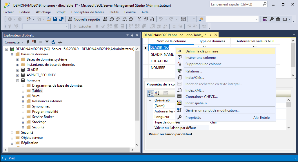 La colonne GLADIR_NO est la clef primaire de la table GLADIR2021. Pour spécifier une colonne comme clef primaire d'une table, vous devez cliquer avec le bouton droit sur la colonne et choisir Définir la clé primaire ou Set Primary Key :