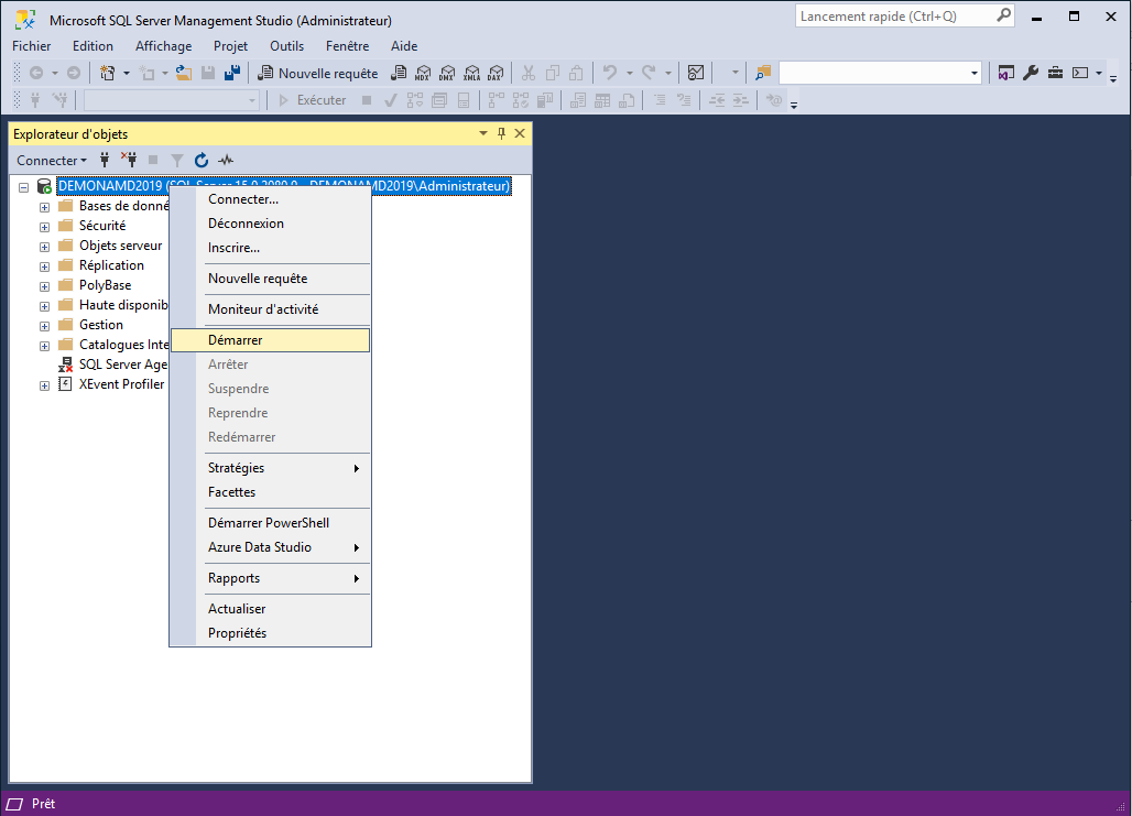 Un serveur de moteur de base de données peut être démarré automatiquement à chaque démarrage du système d'exploitation Windows ou à l'aide de SQL Server Management Studio. Pour démarrer le serveur à l'aide de Management Studio, cliquez avec le bouton droit sur le serveur sélectionné dans le volet Explorateur d'objets ou Object Explorer et cliquez sur Start ou Démarrer dans le menu contextuel :
