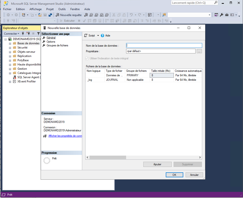 La page Général ou General de la boîte de dialogue Propriétés de la base de données affiche, entre autres, le nom de la base de données, le propriétaire de la base de données, son classement et son modèle de récupération. Les propriétés des fichiers de données appartenant à une base de données particulière comprennent le nom et la taille initiale du fichier, où sera entreposée la base de données, et le type de fichier (PRIMARY, par exemple) et une base de données peut être en entreposée dans plusieurs fichiers :