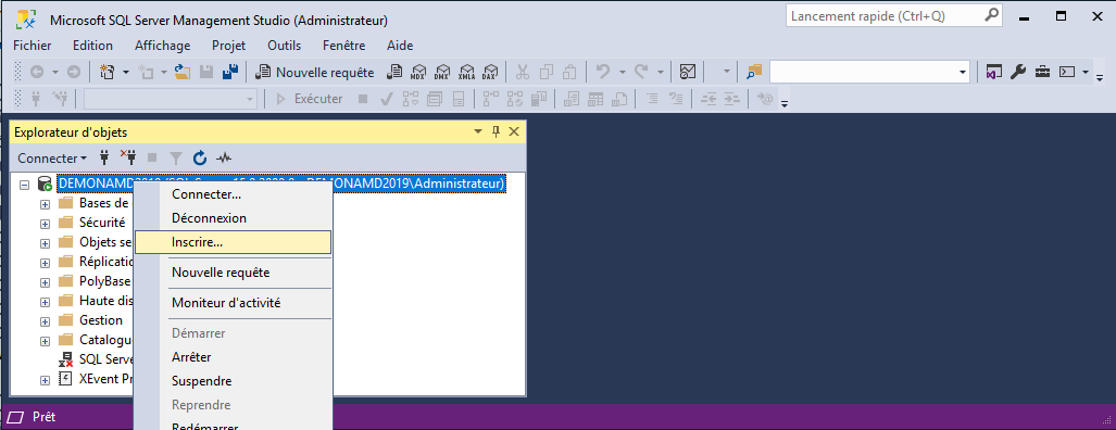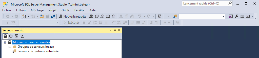 Le SQL Server Management Studio sépare les activités d'enregistrement des serveurs et d'exploration des bases de données et de leurs objets. (Ces deux activités peuvent être effectuées à l'aide de l'Explorateur d'objets.) Chaque serveur (local ou à distance) doit être enregistré avant utilisation. Un serveur peut être enregistré lors de la première exécution de SQL Server Management Studio ou ultérieurement. Pour enregistrer un serveur de base de données, cliquez avec le bouton droit sur le dossier de votre serveur de base de données dans l'Explorateur d'objets et choisissez Inscrire ou Register.