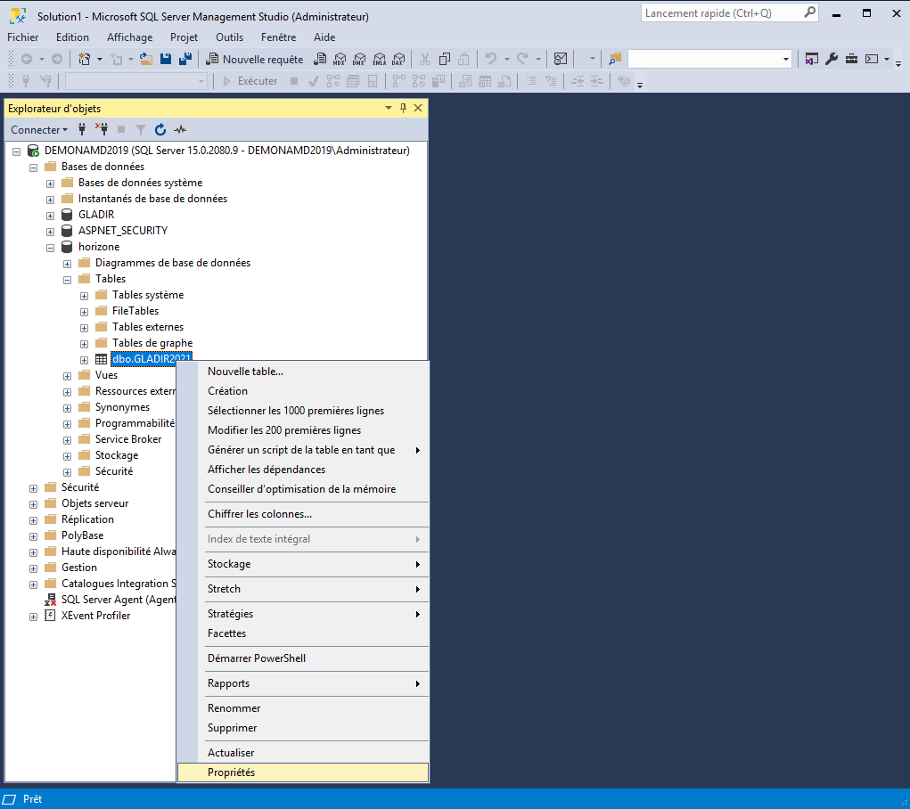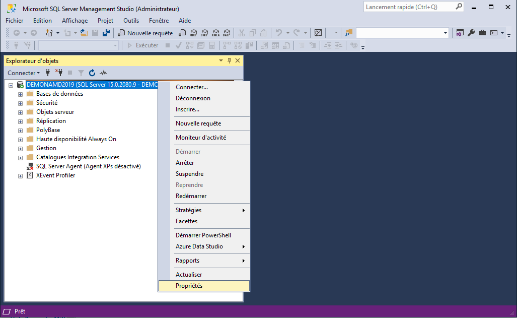 Le SQL Server Management Studio vous permet d'administrer plusieurs serveurs de base de données (appelés instances) sur un ordinateur à l'aide de l'Explorateur d'objets. Chaque instance du moteur de base de données possède son propre ensemble d'objets de base de données (bases de données système et utilisateur) n'étant pas partagés entre différentes instances. Pour gérer un serveur et sa configuration, cliquez avec le bouton droit sur le nom du serveur dans l'Explorateur d'objets ou Object Explorer et choisissez Propriétés ou Properties :