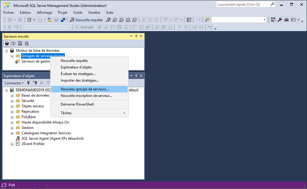 Pour créer un nouveau groupe de serveurs dans le volet Serveurs inscrits ou Registered Servers, cliquez avec le bouton droit sur Groupes de serveurs locaux et choisissez Nouveau groupe de serveurs ou New Server Group :