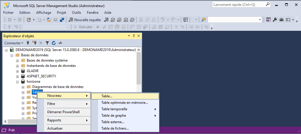 Après avoir créé une base de données, votre prochaine tâche consiste à créer toutes les tables lui appartenant. Encore une fois, vous pouvez créer des tables à l'aide de l'Explorateur d'objets ou de Transact-SQL. Pour créer une table à l'aide de l'Explorateur d'objets, développez le dossier Bases de données, développez la base de données, cliquez avec le bouton droit sur le sous-dossier Tables, puis cliquez sur Nouveau > Table :