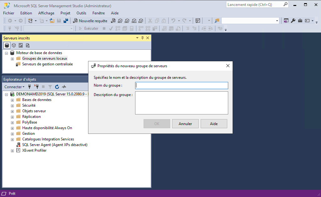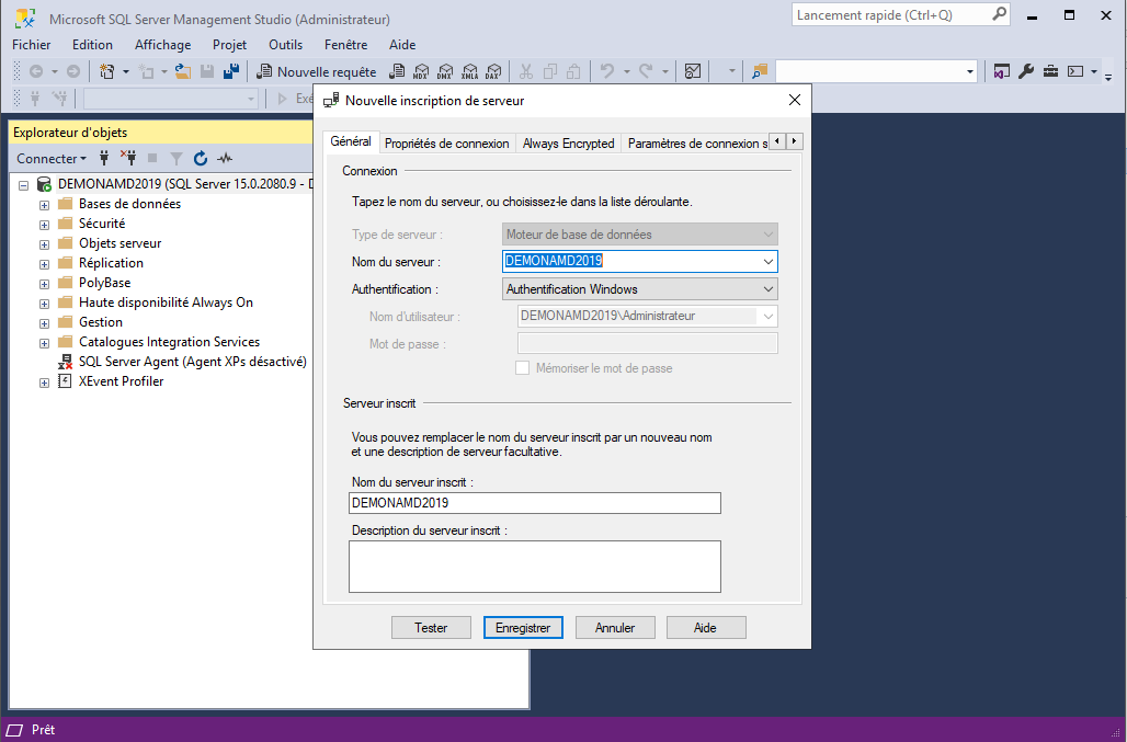 Vous pouvez remplacer le nom de serveur existant par un nouveau nom. Cliquez avec le bouton droit sur le serveur dans la fenêtre Explorateur d'objets et choisissez Inscrire ou Register. Vous pouvez maintenant renommer le serveur et modifier la description du serveur existant dans le cadre Serveur enregistré.