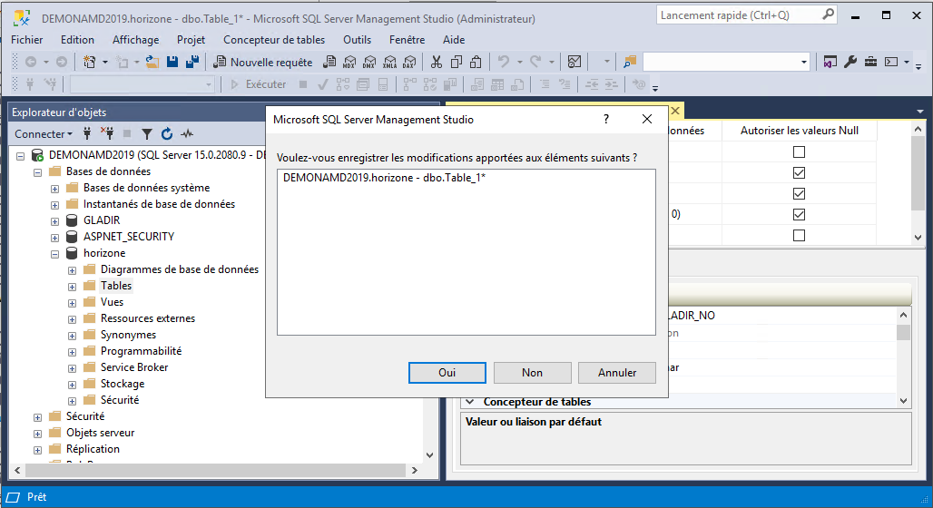 Enfin, fermez le volet de droite avec les informations concernant la nouvelle table. Vous cliquez sur le bouton Oui ou Yes :