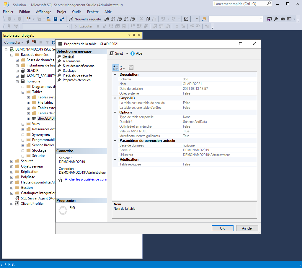 Il affichera la boîte de dialogue Propriétés de la table pour la table GLADIR2021 :