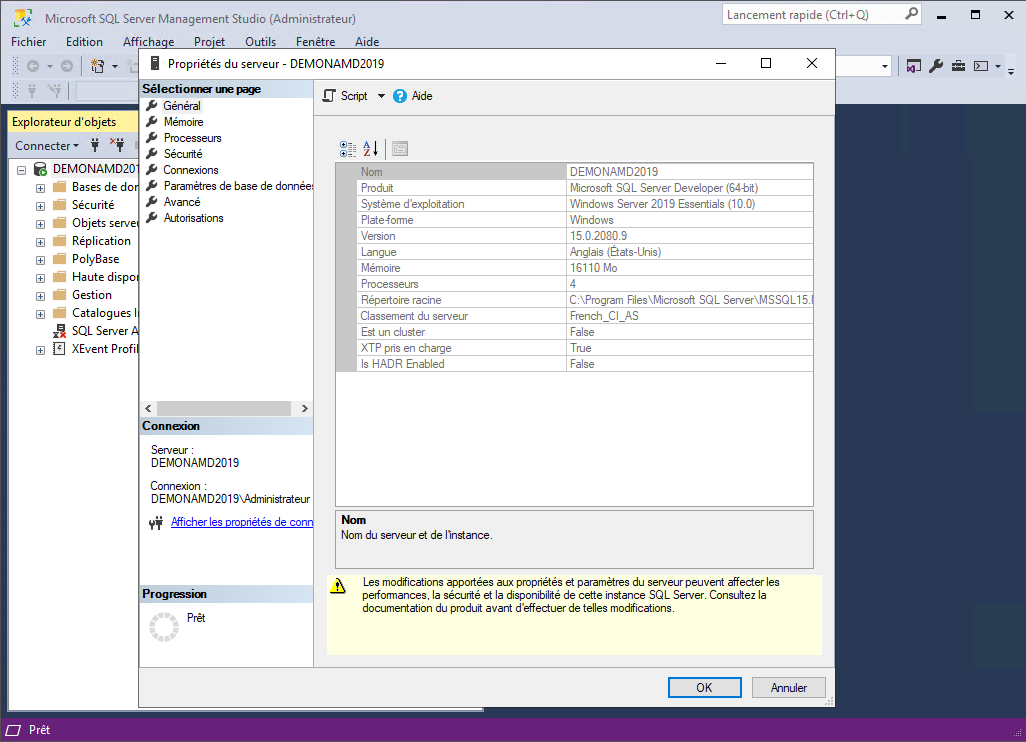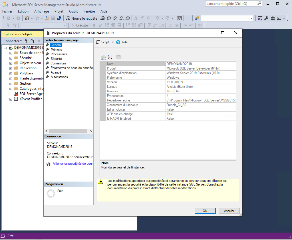 La boîte de dialogue Propriétés du serveur ou Server Properties contient plusieurs pages différentes, telles que Général, Sécurité et Autorisations :
