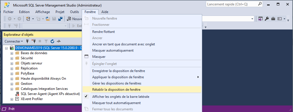Pour restaurer la configuration par défaut, cliquez sur le menu Fenêtre ou Window et sélectionnez Rétablir la disposition de la fenêtre ou Reset Window Layout. Le volet Explorateur d'objets apparaît sur la gauche, tandis que l'onglet Détails de l'Explorateur d'objets apparaît sur le côté droit de SQL Server Management Studio. (L'onglet Détails de l'Explorateur d'objets affiche des informations sur le noeud actuellement sélectionné de l'Explorateur d'objets.)