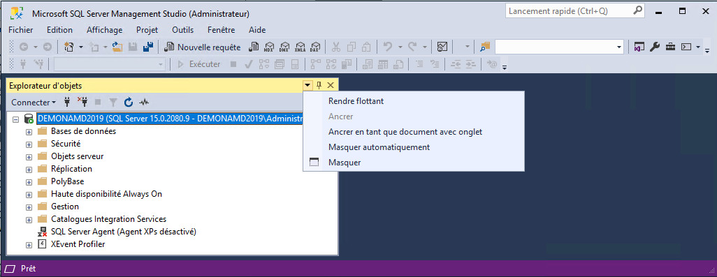 Vous pouvez ancrer ou masquer chacun des volets de Management Studio. En cliquant avec le bouton droit sur la barre de titre en haut du volet correspondant, vous pouvez choisir entre les possibilités de présentation suivantes :