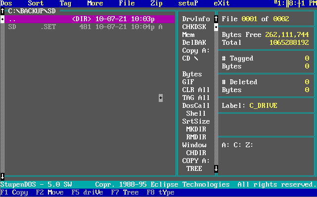 Le logiciel StupenDOS est un gestionnaire de fichiers de style DOS SHELL augmentant votre productivité. Les commandes DOS répétitives sont éliminées grâce à des commandes faciles à utiliser. Le logiciel StupenDOS utilise des menus déroulants, donc toutes les commandes sont facilement accessibles. De nombreuses touches de raccourci sont également fournies, de sorte que lorsque vous vous familiariserez avec le programme, vous pourrez devenir encore plus productif. Vous pouvez même reconfigurer le clavier afin de pouvoir configurer et créer vos propres touches de raccourci.