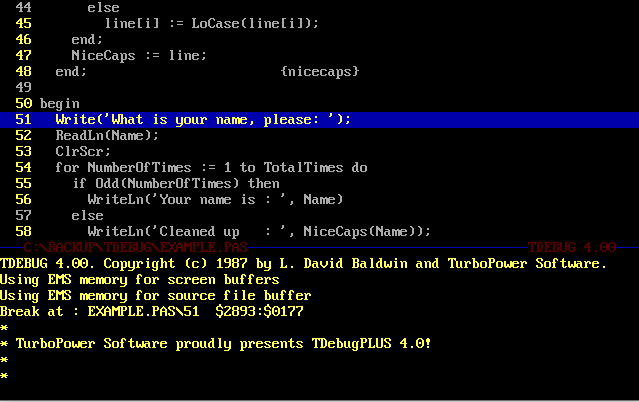 Le logiciel T-DebugPLUS 4.00 est un débogueur d'exécution symbolique à utiliser avec Turbo Pascal. T-Debug Plus est antérieur aux propres débogueurs de Borland. Il prend en charge l'affichage du code source, le pas à pas et l'affichage et la modification des variables. L'entreprise Turbopower a également produit d'autres outils logiciels tels que Turbo Analyst et Turbopower Utilities pour Turbo Pascal 3.0.
