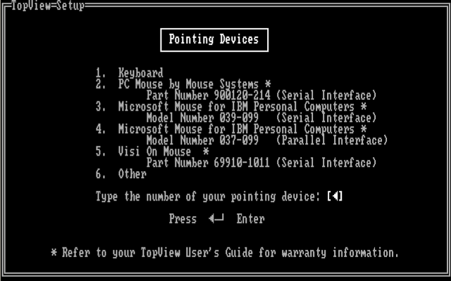 - Tapez le numéro du périphérique de pointage que vous utilisez et appuyez sur Enter. Si vous utilisez un périphérique de pointage non répertorié dans le menu des périphériques de pointage, vous devez fournir un pilote de périphérique compatible. Choisissez d'autres dans le menu. Ensuite, lorsqu'il est instruit, insérez la disquette avec le programme du pilote de périphérique dans l'unité de disque A pour permettre à TopView de copier quelques informations sur votre périphérique de pointage. Les prochaines fenêtres demandent des informations sur votre souris, si vous en utilisez une et votre affichage couleur, si vous avez un adaptateur de moniteur couleur/graphique.