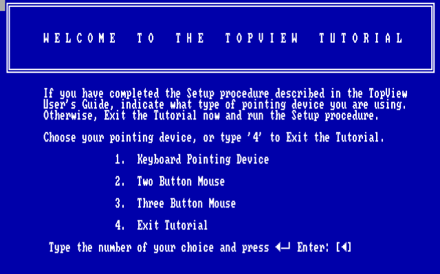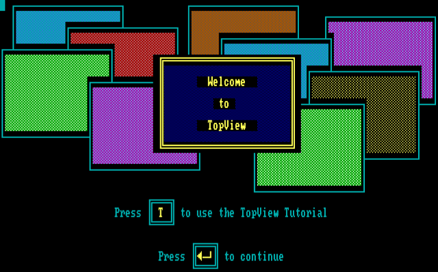 - Vous êtes maintenant à la première fenêtre de tutoriel. Suivez les instructions de cette fenêtre. Ils vous guideront à travers le tutoriel, étape par étape. Si votre imprimante est allumée, vous pouvez imprimer n'importe quelle fenêtre de tutoriel en appuyant sur les touches Shift et PrtSc en même temps. Si vous avez un système basé sur une disquette, vous devez noter l'option /F. Pendant ce temps, prenez votre temps à apprendre TopView et amusez-vous !