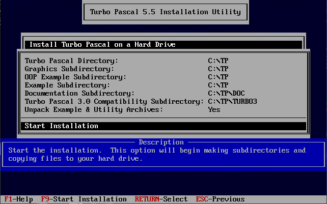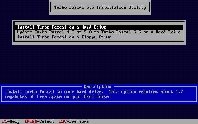 Choisissez l'option «Install Turbo Pascal on a Hard Drive». Vous cliquez sur la touche Enter :