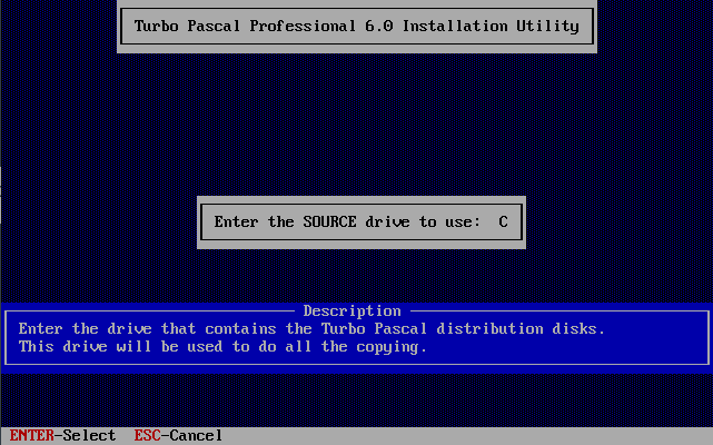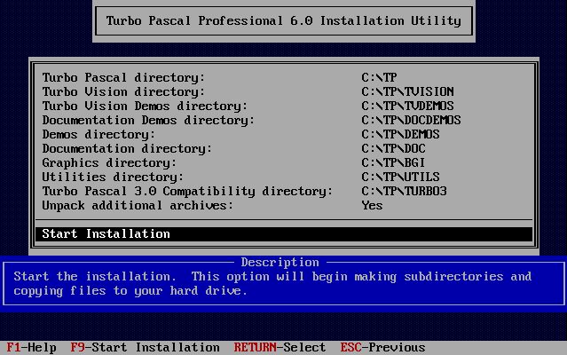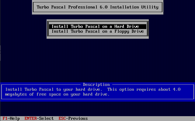 Choisissez l'option «Install Turbo Pascal on a Hard Drive». Vous cliquez sur la touche Enter :