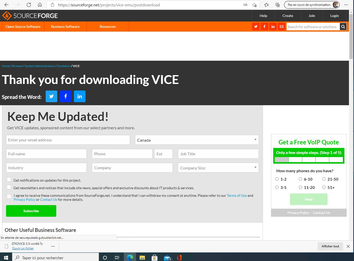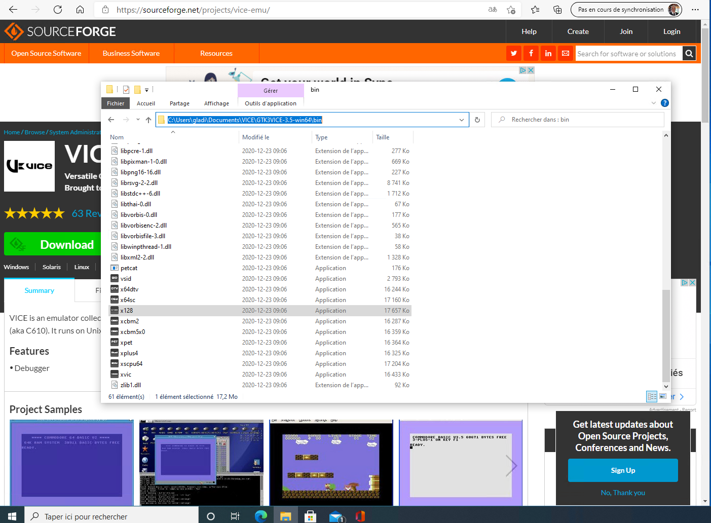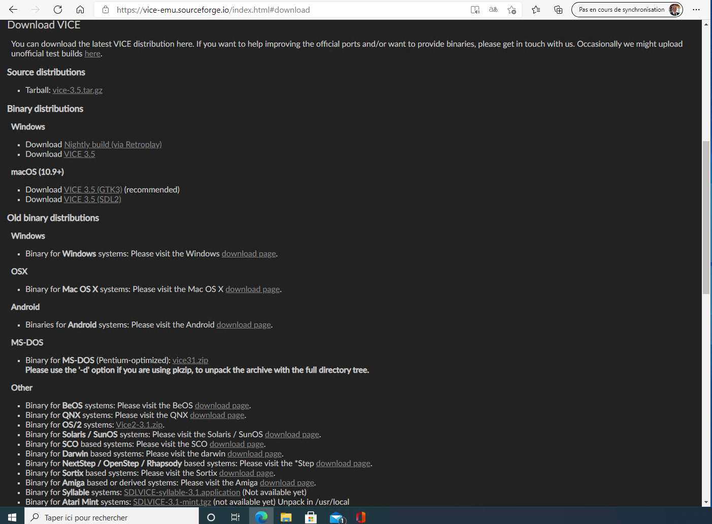 L'installation du logiciel du VICE sous Windows 10 se fait de la manière suivante. Vous devez tout d'abord allez sur le site du VICE au lien suivant https://vice-emu.sourceforge.io/index.html#download. Vous cliquez sur la lien VICE x.x (dans l'exemple suivant VICE 3.5) la liste Windows :