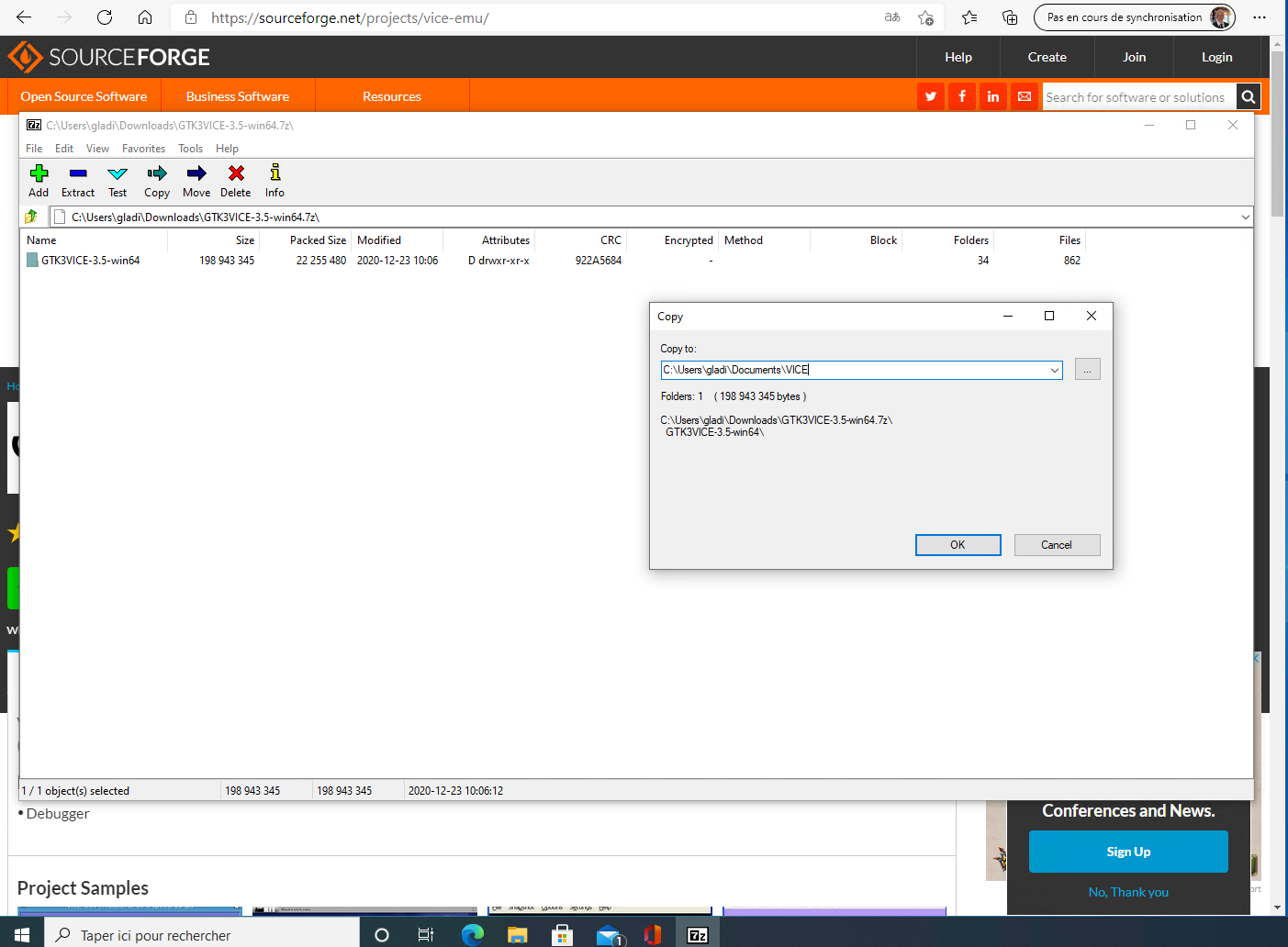 Une fois que l'application 7-Zip ouvert le fichier .7z, vous cliquez sur le bouton Extract et vous entrez le répertoire où vous souhaitez l'installer (dans notre exemple C:\Users\glad\Documents\VICE) et vous cliquez sur le bouton OK :