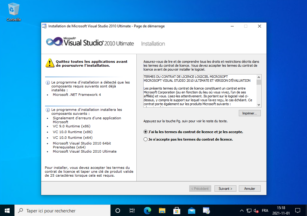 Il commence a installer les composantes nécessaires au Visual Studio 2010, vous le laissez continuer :