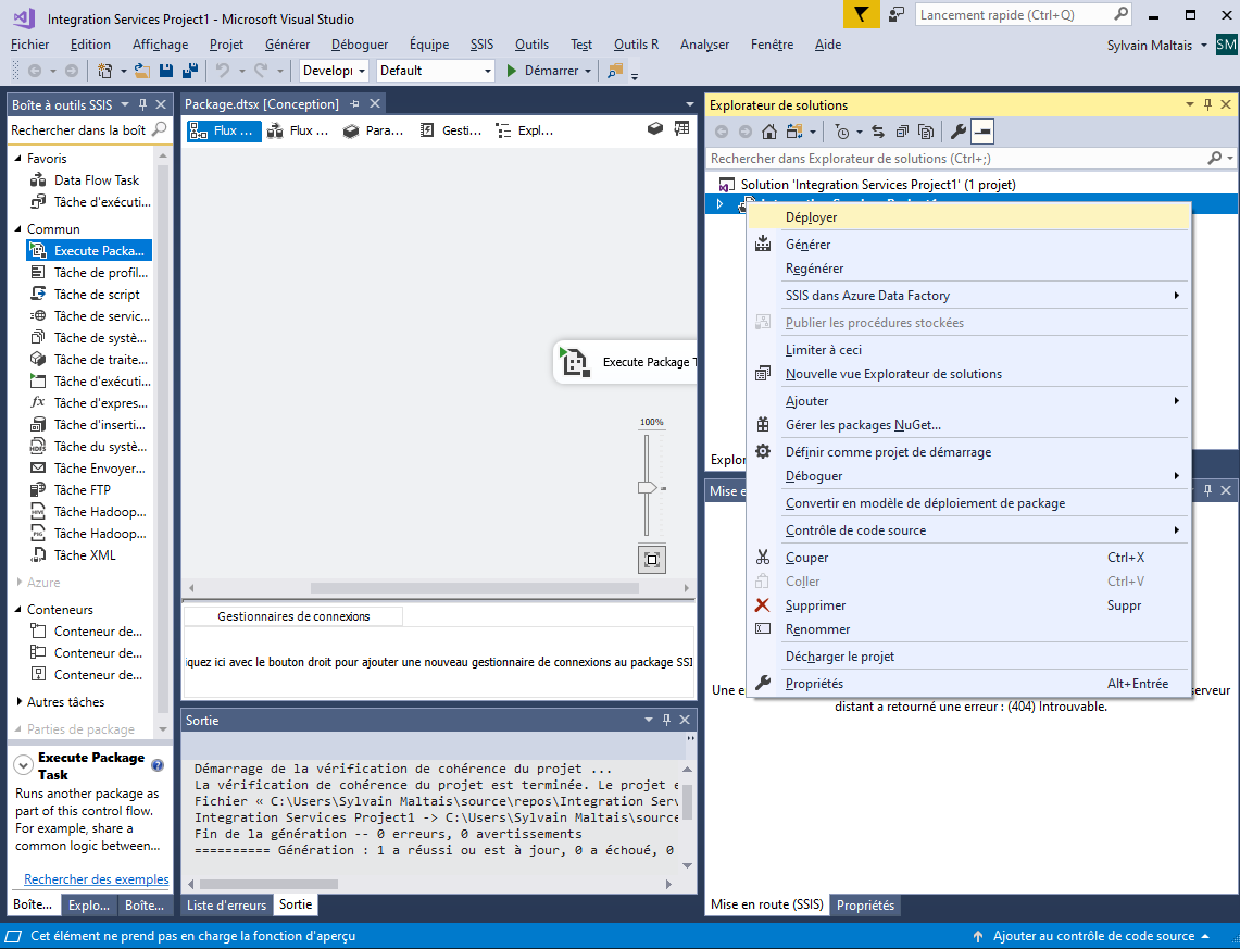 Voici les différentes étapes d'un déploiement de SSIS sur un serveur SQL Server avec Visual Studio 2017. Tous d'abord, vous devez avoir votre projet ouvert dans Visual Studio 2017. Vous aller dans l'arbre de l'Explorateur de solutions et vous cliquez sur le deuxième bouton de la souris sur le projet de façon à voir apparaître un menu contextuel. Vous sélectionner l'option «Déployer» :
