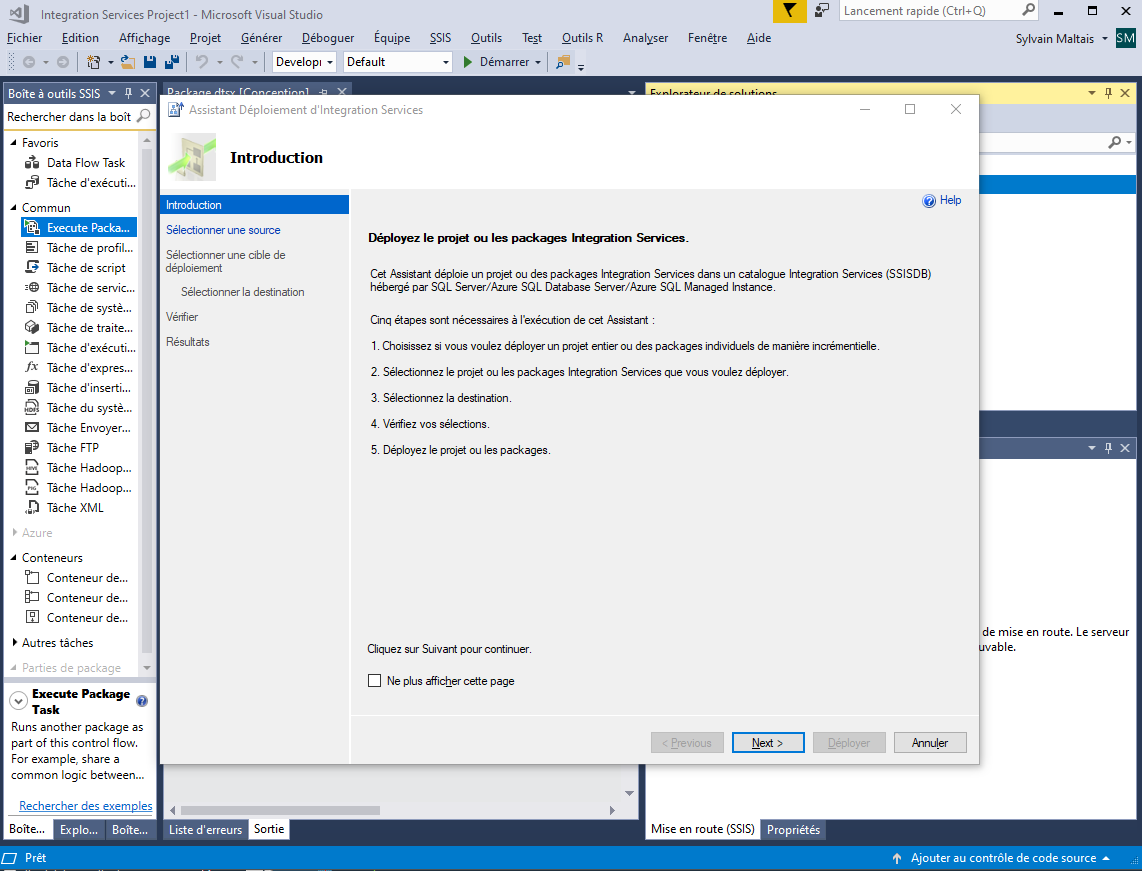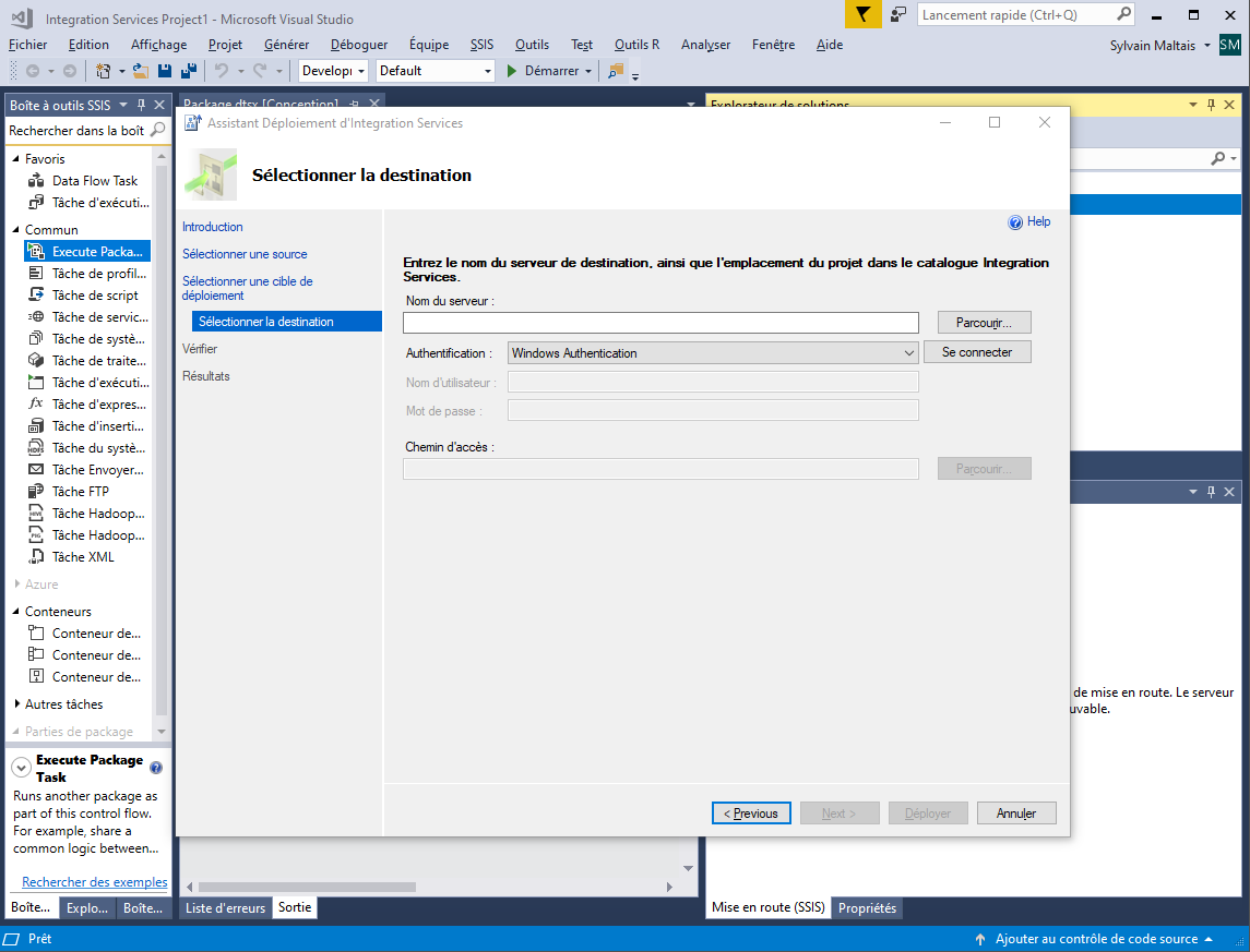 Il vous demande vers quel serveur vous souhaitez installer le projet SSIS. Vous entrez le nom du serveur et vous cliquez sur le bouton Se connecter :