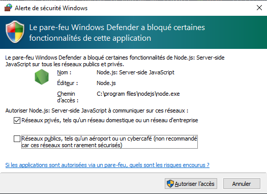 Pour les besoins de cette discussion, créez une application Azure Node.js Express 4 de base. Une fois que vous avez fourni un nom et cliqué sur OK, le projet est créé. Il y a une étape supplémentaire (et, pour la plupart des modèles de projet, relativement inhabituelle) devant être effectuée. Node.js fournit les fonctionnalités d'un serveur Web et écoute sur le port 80 les requêtes entrantes. Pour des raisons de sécurité, Windows n'autorise pas les demandes entrantes sur le port 80 sans nécessiter l'approbation de l'administrateur. Par conséquent, vous devez approuver cette fonctionnalité avant qu'elle ne fonctionne. Vous verrez donc une boîte de dialogue d'avertissement similaire à celle illustrée à l'image suivante. Cliquez sur le bouton Autoriser l'accès (Allow access) pour autoriser Node.js à traiter sa demande Web :