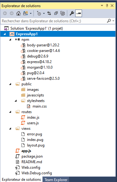 Maintenant que vous avez créé un projet Node.js (à l'aide d'Express 4), un projet contenant divers composantes vous sera présenté. L'explorateur de solutions (Solution Explorer) pour le projet est illustré dans l'image suivante :