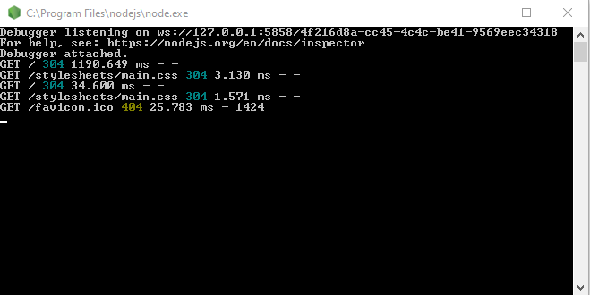 L'initialisation du serveur Node.js consiste à commencer à écouter sur le port 1337 (non mentionné dans la console, mais c'est le port utilisé pour les requêtes Web "typiques" dans l'exemple d'application) et sur le port 5858 pour les requêtes de débogage. Il traite ensuite une requête GET sur la page par défaut (indiquée par la barre oblique inverse) et une requête GET sur la feuille de style main.css. Au fur et à mesure que vous continuez à travailler avec votre application, des messages supplémentaires apparaîtront dans la fenêtre.