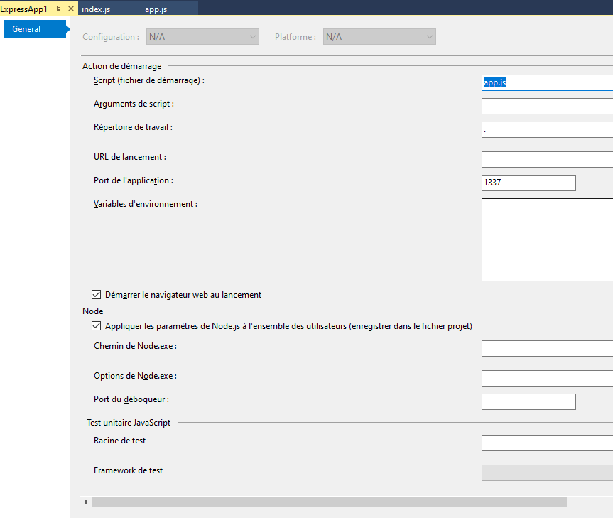 Les ports utilisés par le serveur Node.js sont entièrement paramétrables. Cela se fait via les propriétés du projet, illustrées dans l'image suivante :