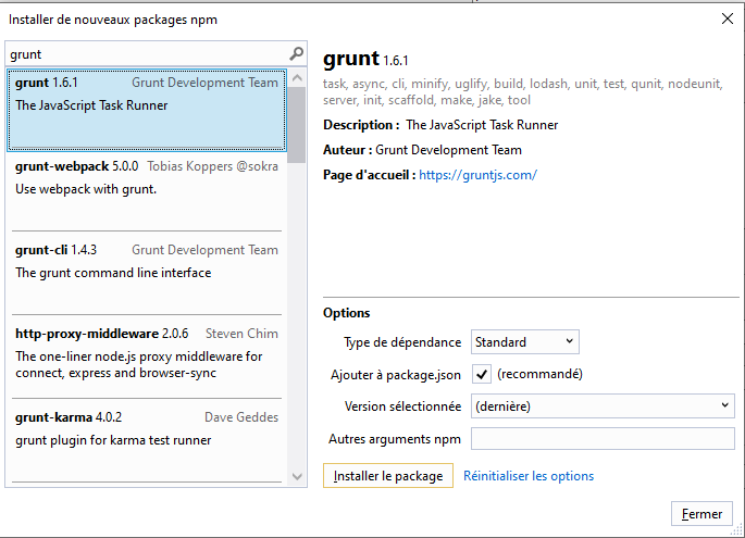 Dans la zone de texte en haut à gauche de la boîte de dialogue, entrez le nom du paquet que vous souhaitez installer. Dans l'image précédente, vous pouvez voir que le paquet grunt a été spécifié, ce qui a entraîné un assez grand nombre de paquets correspondant à «grunt» apparaissant à gauche. Lorsque vous sélectionnez un paquet particulier, les détails de ce paquet s'affichent dans le volet de droite.