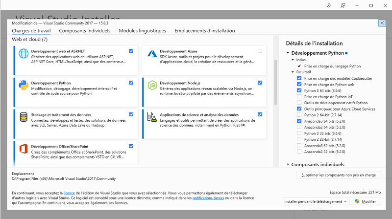 Ils sont également inclus dans la charge de travail Applications de science et analyse des données. Par défaut, cette charge de travail inclut la prise en charge du modèle Cookiecutter et la prise en charge de Python 3 pour les systèmes 64 bits. Via l'onglet Composants individuels disponible dans la charge de travail actuellement sélectionnée, vous pouvez également inclure la Prise en charge du Python IoT (Internet des objets), Outils principaux pour Azure Cloud Services, la prise en charge d'Anaconda (version 2 ou 3 sur les systèmes 32 et 64 bits) et la future prise en charge de Python (également version 2 ou 3 sur les systèmes 32 et 64 bits).