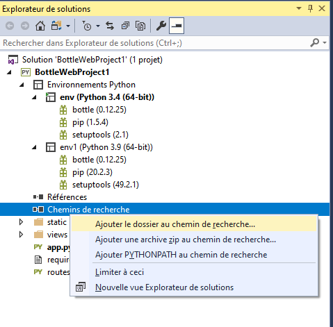 Pour ajouter un chemin de recherche à votre projet, cliquez avec le bouton droit sur l'élément Chemins de recherche dans l'explorateur de solutions et sélectionnez «Ajouter un dossier au chemin de recherche...» :