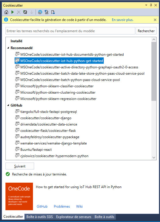 L'idée derrière un gabarit dans le monde Python est de fournir un mécanisme pour générer automatiquement du code étant fréquemment réutilisé dans ou entre les projets. Pour aider à soutenir cette productivité, Visual Studio 2017 inclut la prise en charge de l'extension de gabarit Cookiecutter (Cookiecutter est officiellement présent depuis Visual Studio 15 Preview 5).