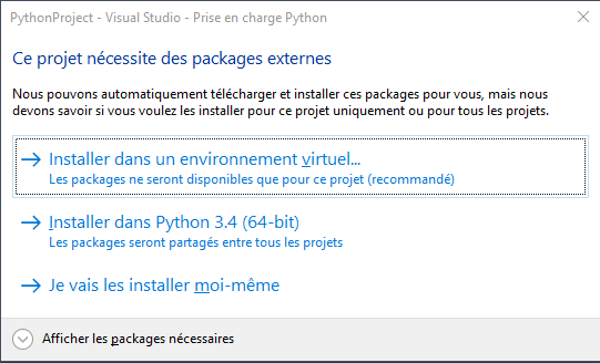 Dans le cadre de l'installation de la charge de travail Python, vous disposiez d'un certain nombre d'environnements différents à installer. Ceux que vous avez choisi d'installer auront un impact sur certains des formulaires illustrés dans les quelques figures suivantes. Les environnements installés via la charge de travail ont été créés en tant qu'environnements globaux. Ce sont des environnements disponibles pour chaque projet. Il est également possible d'installer un environnement spécifiquement pour un projet.