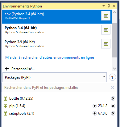 En Python, un environnement est une collection d'outils dans lesquels vous exécutez votre code. Il se compose d'un interpréteur, d'une bibliothèque (le plus souvent la bibliothèque standard Python) et d'un ensemble de paquets installés. Ces trois composantes déterminent ensuite les constructions de langage et la syntaxe valides, les fonctionnalités du système d'exploitation auxquelles vous avez accès et les paquets pouvant être mis à votre disposition. De plus, dans Visual Studio, un environnement se compose d'une base de données Intellisense appropriée pour les bibliothèques.