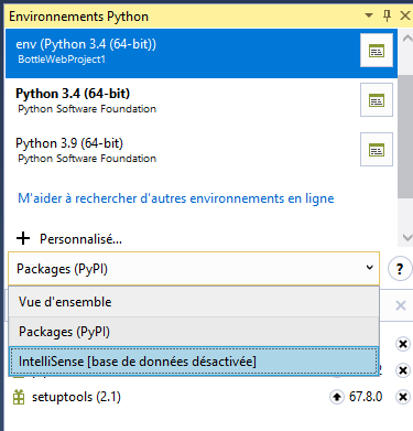 Si vous sélectionnez Packages dans la liste déroulante, vous pouvez voir les paquets installés pour l'environnement. Il s'agit de la même liste apparaissant dans le noeud d'environnement dans l'explorateur de solutions. Si vous sélectionnez IntelliSense dans la liste déroulante, vous pouvez voir les bibliothèques incluses dans la base de données d'achèvement et vous avez la possibilité de l'actualiser :