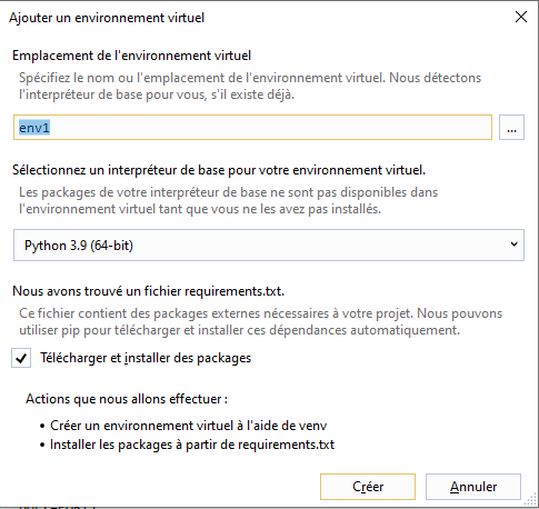 Il est possible que deux projets différents installés en tant qu'environnement global aient des bibliothèques incompatibles. Cela signifie que vous ne pourrez pas les utiliser dans un projet. Pour résoudre ce problème, Visual Studio offre la possibilité de créer un environnement virtuel. Dans un environnement virtuel, il y a les mêmes composantes que dans un environnement Python normal. La différence est que les paquets faisant partie de l'environnement sont isolés à la fois de l'environnement global et de tout autre environnement virtuel.