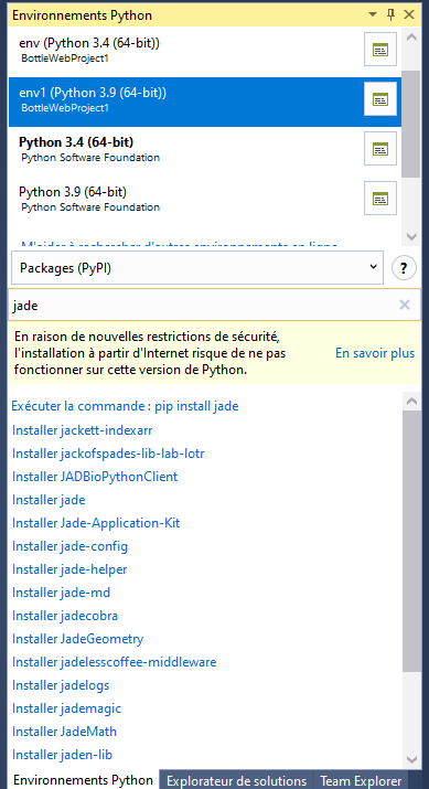 Immédiatement au-dessus de la liste des paquets installés, il y a une zone de texte pouvant être utilisée pour rechercher des paquets dans l'index de paquets Python (PyPI). L'image suivante montre les résultats d'une recherche du moteur de gabarit Jade. Cliquez sur le lien approprié pour installer le paquet dans votre environnement :