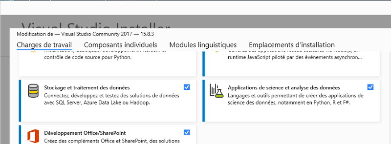 Vos déploiements HDInsight et Azure Data Lake dans Azure peuvent être gérés et utilisés via Visual Studio 2017. Pour ce faire, vous pouvez installer Stockage et traitement des données (sur la version anglais Data Storage and Processing workload) à l'aide du programme d'installation de Visual Studio :