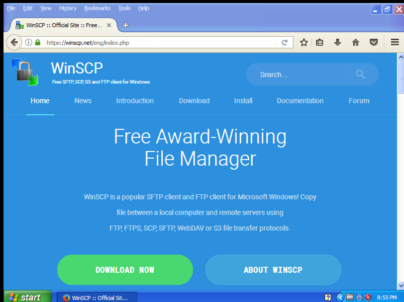 Tout d'abord, vous devez aller sur le site Web de WinSCP : http://www.winscp.net/ et vous cliquez sur le gros bouton vert «DOWNLOAD NOW» :