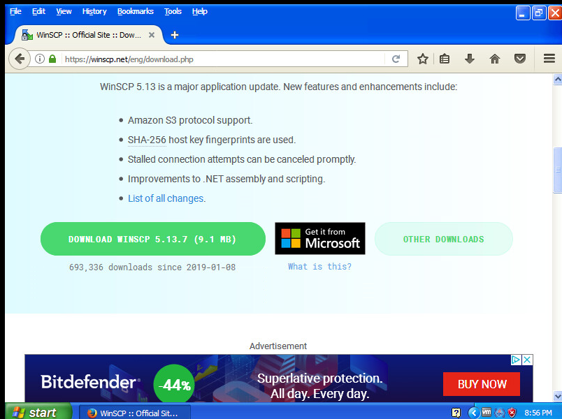 Ensuite, vous descendez dans la page et vous cliquez sur le bouton «DOWNLOAD WINSCP X.XX.X» correspondant à la version :