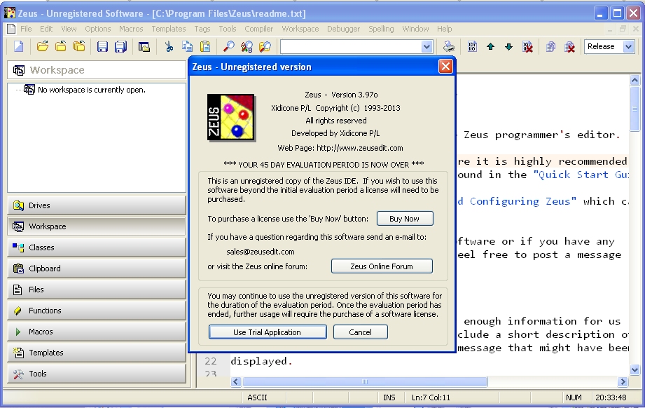 Ce logiciel, appelé Zeus, et parfois aussi Zeus IDE, de l'éditeur Xidicone, est un des plus anciens de code source commercial ou payant existant sur le marché, il date de 1993. Il est dans le même style que Notepad++ et rend naturellement les mêmes services. Côté option de configuration, il est assez effrayant. Il ouvre de nombreuses possibilités à celui sachant l'exploiter correctement.